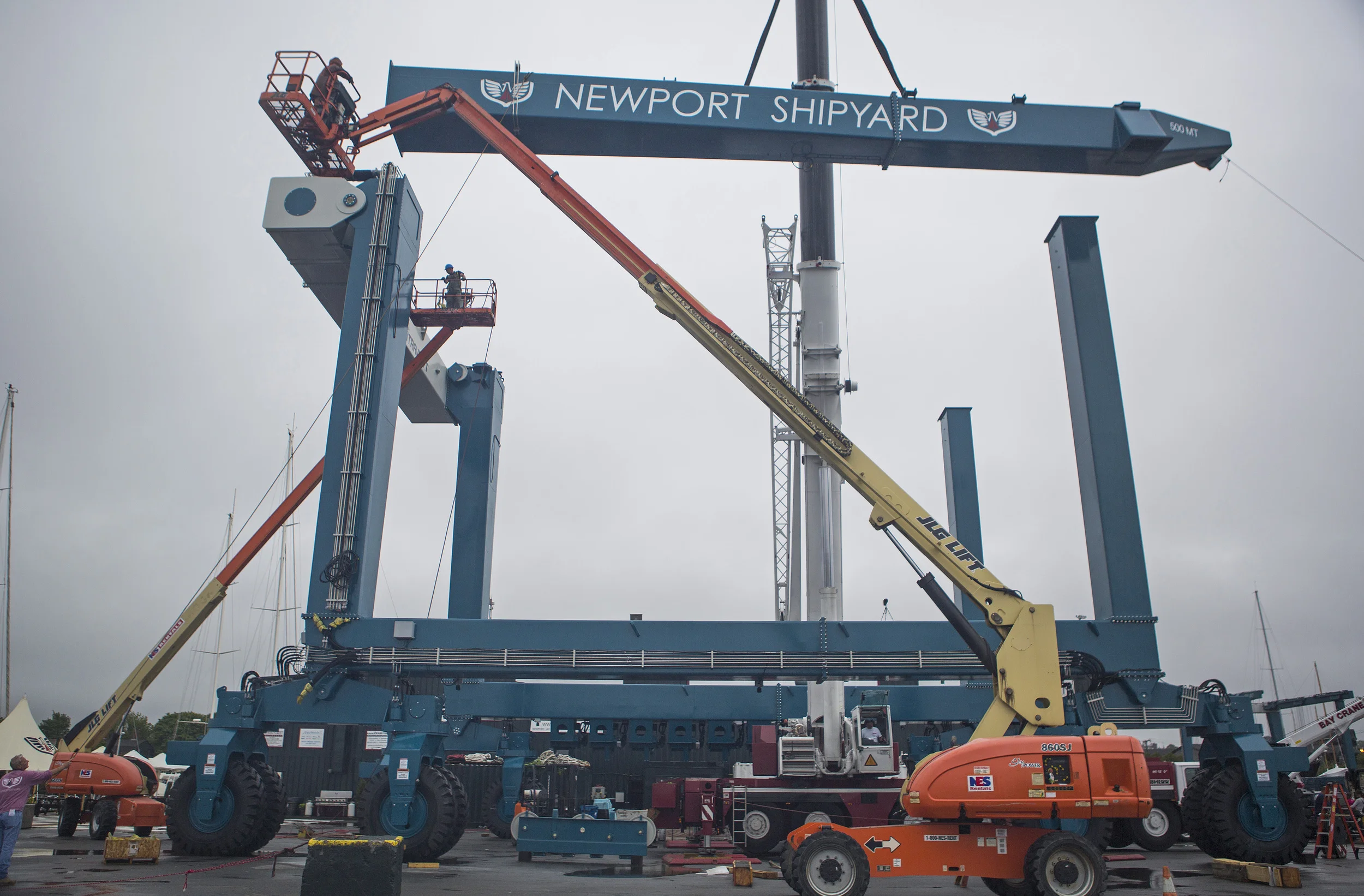 Newport Shipyard is pleased to announce the acquisition of the largest lift in New England, just in time for the 2013 season! The yard's new 500-Ton Marine TravelLift will expand haul-out capabilities and optimize boat storage on the hard, allowing all but the largest vessels to undergo dry-dock service and repairs right in the heart of Newport. The new lift recently arrived at our facility and is scheduled to be in service by June 21st. The lift has four fully-articulated wheel-bases for precision maneuvering in the busy yard, which should allow for more efficient storage and open up several hundred feet of additional dry-dock capacity. The machine is controlled from a remote console worn by the operator to permit full visibility and ensure clearance from any angle. Additional features include night-time work lights for emergency haul-outs and a sound suppression package to reduce engine noise.