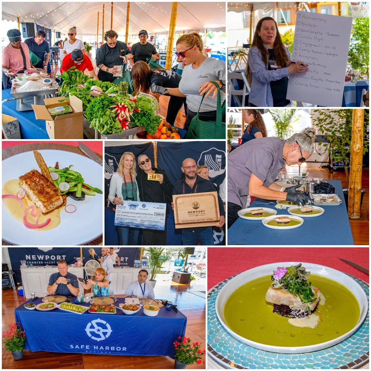 Clockwise from top left: Best Chef Competition contenders shop the marketplace, Winnie DeCosta presents themes, M/Y In the Zone’s Chef Gabby Piotto, Piotto’s winning “Anniversary” dish entrée, celebrity judges, Chef Garrett Hamilton’s “New Year’s Eve” inspired striped bass, Piotto receives her awards from representatives of sponsor National Marine Suppliers. Credit Michele Almeida/Miste Photography