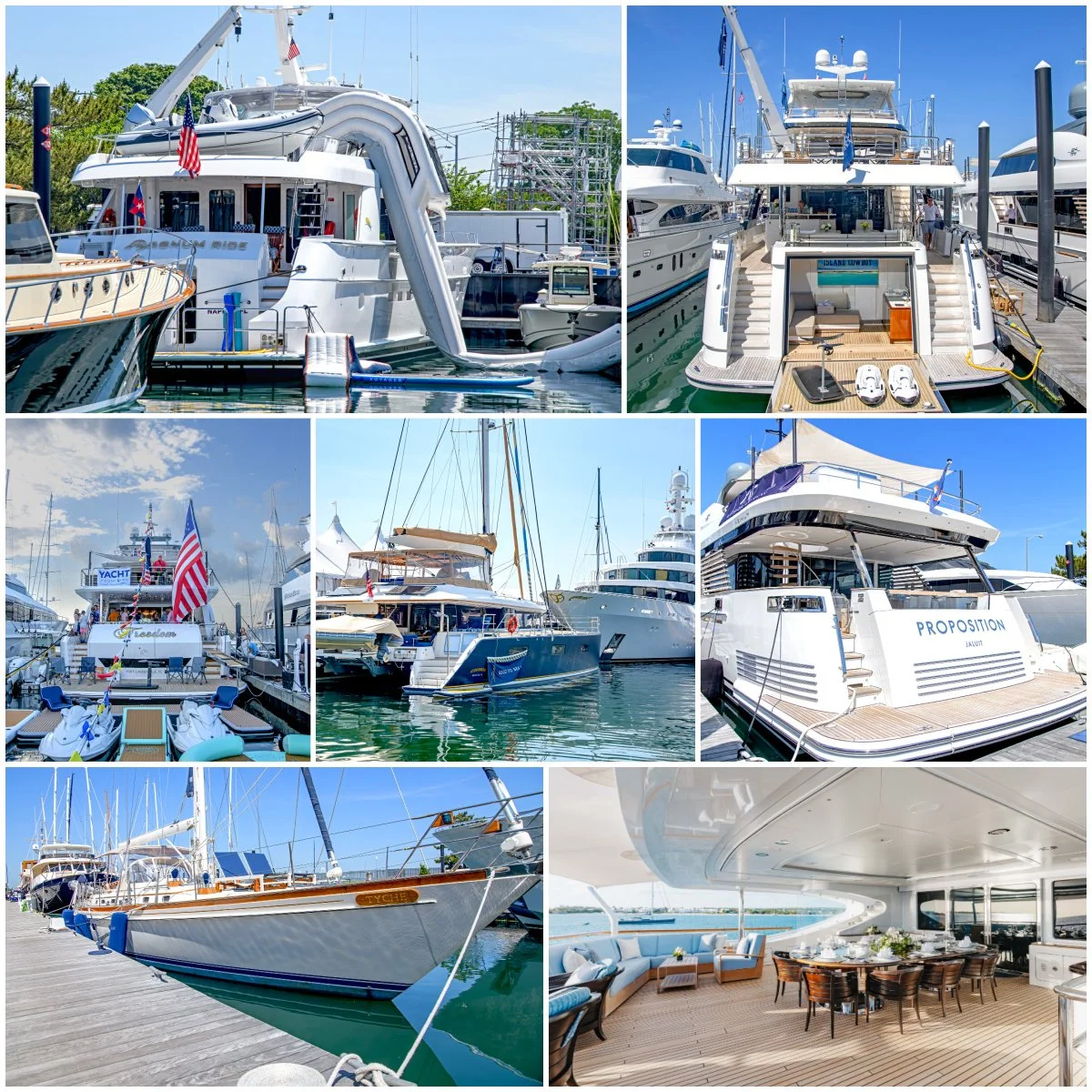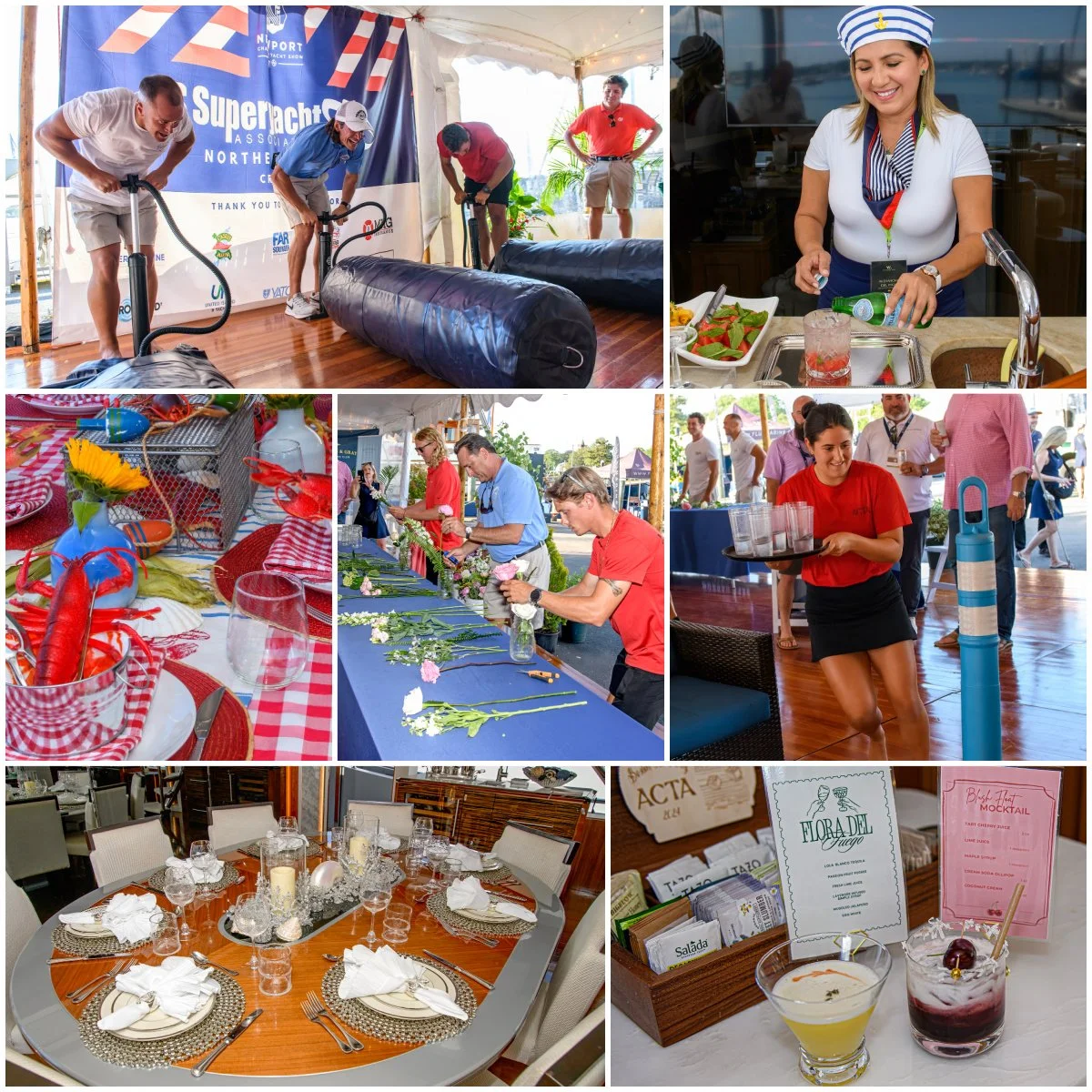 Clockwise from top left: M/Y Magnum Ride, M/Y Island Cowboy, M/Y Proposition, M/Y Lady B’s dining deck, S/Y Tyche, M/Y Freedom, and S/Y Andromeda with M/Y Acta at the 2025 Newport Charter Yacht Show. Credit Michele Almeida/Miste Photography